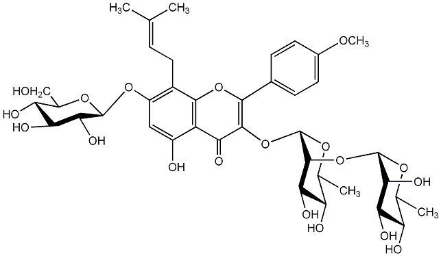 InChI=1S/C39H50O19/c1-14(2)6-11-19-21(54-38-32(50)29(47)26(44)22(13-40)55-38)12-20(41)23-27(45)35(33(56-34(19)23)17-7-9-18(51-5)10-8-17)57-39-36(30(48)25(43)16(4)53-39)58-37-31(49)28(46)24(42)15(3)52-37/h6-10,12,15-16,22,24-26,28-32,36-44,46-50H,11,13H2,1-5H3/t15-,16+,22+,24+,25+,26-,28-,29+,30-,31+,32+,36+,37+,38-,39+/m1/s1 |