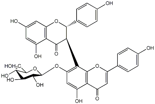 InChI=1S/C36H30O15/c37-13-25-30(44)32(46)33(47)36(51-25)50-24-12-21(43)26-20(42)11-22(14-1-5-16(38)6-2-14)48-35(26)28(24)29-31(45)27-19(41)9-18(40)10-23(27)49-34(29)15-3-7-17(39)8-4-15/h1-12,25,29-30,32-34,36-41,43-44,46-47H,13H2/t25-,29+,30-,32-,33-,34-,36+/m0/s1 |