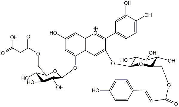 InChI=1S/C39H38O21/c40-18-5-1-16(2-6-18)3-8-29(46)54-14-26-31(48)34(51)36(53)39(60-26)58-25-12-20-23(56-37(25)17-4-7-21(42)22(43)9-17)10-19(41)11-24(20)57-38-35(52)33(50)32(49)27(59-38)15-55-30(47)13-28(44)45/h1-12,26-27,31-36,38-39,48-53H,13-15H2,(H4-,40,41,42,43,44,45,46)/p+1/t26-,27+,31-,32-,33+,34+,35-,36-,38-,39-/m1/s1 |