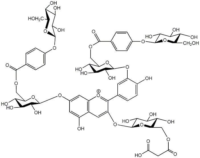 c1(cc(c2c(c1)[o+]c(c(c2)O[C@H]1[C@@H]([C@H]([C@@H]([C@H](O1)COC(=O)CC(=O)O)O)O)O)c1ccc(c(c1)O[C@H]1[C@H]([C@H]([C@@H]([C@H](O1)COC(=O)c1ccc(cc1)O[C@H]1[C@@H]([C@H]([C@@H]([C@H](O1)CO)O)O)O)O)O)O)O)O)O[C@H]1[C@@H]([C@H]([C@@H]([C@@H](O1)COC(=O)c1ccc(cc1)O[C@@H]1O[C@H]([C@H]([C@@H]([C@@H]1O)O)O)CO)O)O)O |