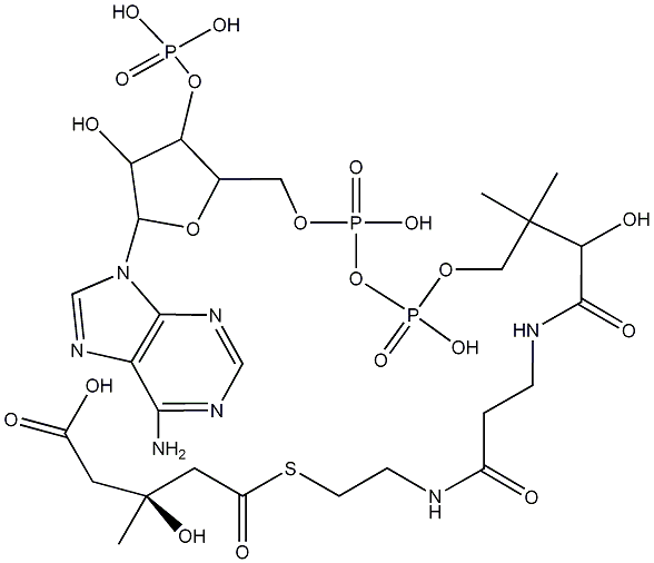 InChI=1S/C27H44N7O20P3S/c1-26(2,21(40)24(41)30-5-4-15(35)29-6-7-58-17(38)9-27(3,42)8-16(36)37)11-51-57(48,49)54-56(46,47)50-10-14-20(53-55(43,44)45)19(39)25(52-14)34-13-33-18-22(28)31-12-32-23(18)34/h12-14,19-21,25,39-40,42H,4-11H2,1-3H3,(H,29,35)(H,30,41)(H,36,37)(H,46,47)(H,48,49)(H2,28,31,32)(H2,43,44,45)/t14-,19+,20+,21+,25+,27-/m0/s1 |