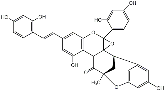 InChI=1S/C34H26O10/c1-32-15-24(18-10-21(37)12-22(11-18)42-32)33-30(31(32)41)29-27(40)8-16(2-3-17-4-5-19(35)13-25(17)38)9-28(29)43-34(33,44-33)23-7-6-20(36)14-26(23)39/h2-14,24,30,35-40H,15H2,1H3/b3-2+/t24-,30-,32+,33+,34+/m1/s1 |