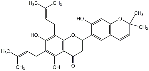 InChI=1S/C30H34O6/c1-16(2)7-9-19-27(33)20(10-8-17(3)4)29-26(28(19)34)23(32)15-25(35-29)21-13-18-11-12-30(5,6)36-24(18)14-22(21)31/h7-8,11-14,25,31,33-34H,9-10,15H2,1-6H3/t25-/m0/s1 |