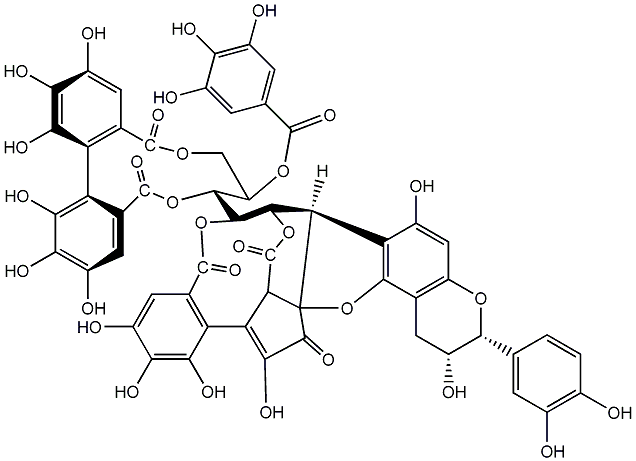InChI=1S/C55H38O30/c56-18-2-1-12(3-19(18)57)44-26(64)6-14-27(80-44)10-20(58)32-34-47-48(84-53(77)17-9-25(63)39(68)42(71)31(17)33-35(54(78)83-47)55(34,85-45(14)32)49(73)43(33)72)46-28(81-50(74)13-4-21(59)36(65)22(60)5-13)11-79-51(75)15-7-23(61)37(66)40(69)29(15)30-16(52(76)82-46)8-24(62)38(67)41(30)70/h1-5,7-10,26,28,34-35,44,46-48,56-72H,6,11H2/t26-,28+,34+,35+,44-,46+,47-,48-,55-/m0/s1 |