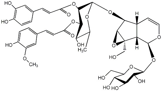 InChI=1S/C40H46O20/c1-17-29(48)34(56-26(46)10-6-19-4-8-22(44)24(14-19)52-2)35(57-27(47)9-5-18-3-7-21(43)23(45)13-18)39(54-17)58-33-20-11-12-53-37(28(20)40(16-42)36(33)60-40)59-38-32(51)31(50)30(49)25(15-41)55-38/h3-14,17,20,25,28-39,41-45,48-51H,15-16H2,1-2H3/b9-5+,10-6+/t17-,20-,25+,28+,29+,30+,31-,32-,33-,34-,35+,36-,37-,38-,39+,40+/m0/s1 |