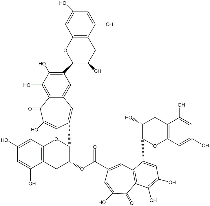 InChI=1S/C50H38O21/c51-19-6-28(54)24-13-34(60)48(69-36(24)9-19)23-12-33(59)45(65)41-22(23)3-18(5-32(58)44(41)64)50(67)71-39-15-26-30(56)8-21(53)11-38(26)68-47(39)17-1-16-2-27(42(62)46(66)40(16)43(63)31(57)4-17)49-35(61)14-25-29(55)7-20(52)10-37(25)70-49/h1-12,34-35,39,47-49,51-56,59-62,65-66H,13-15H2,(H,57,63)(H,58,64)/t34-,35+,39+,47+,48-,49+/m1/s1 |