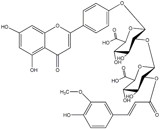 InChI=1S/C37H34O20/c1-51-22-10-14(2-8-18(22)39)3-9-24(42)54-32-28(45)26(43)31(35(49)50)56-37(32)57-33-29(46)27(44)30(34(47)48)55-36(33)52-17-6-4-15(5-7-17)21-13-20(41)25-19(40)11-16(38)12-23(25)53-21/h2-13,26-33,36-40,43-46H,1H3,(H,47,48)(H,49,50)/b9-3+/t26-,27-,28-,29-,30-,31-,32+,33+,36+,37-/m0/s1 |