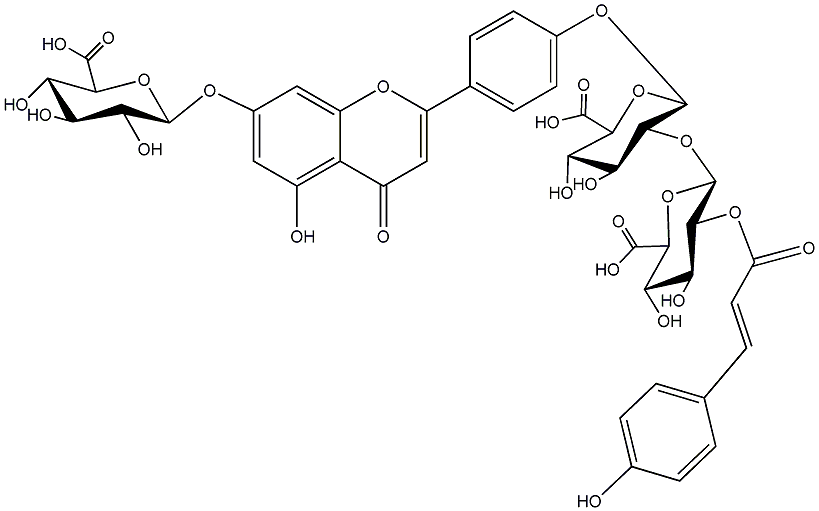 Apigenin 7-glucuronide-4'-(2'''-E-p-coumaroylglucuronosyl)-(1->2)-glucuronide 4-[7-(beta-D-Glucopyranuronosyloxy)-5-hydroxy-4-oxo-4H-1-benzopyran-2-yl]phenyl 2-O-[2-O-[(2E)-3-(4-hydroxyphenyl)-1-oxo-2-propenyl]-beta-D-glucopyranuronosyl]-beta-D-glucopyranosiduronic acid |