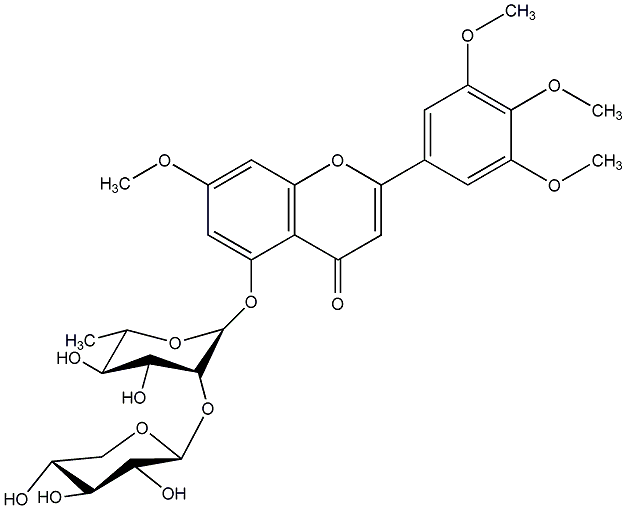 Tricetin 7,3',4',5'-trimethyl eter 5-xylosyl-(1->2)-rhamnoside 5-[(6-Deoxy-2-O-beta-D-xylopyranosyl-alpha-L-mannopyranosyl)oxy]-7-methoxy-2-(3,4,5-trimethoxyphenyl)-4H-1-benzopyran-4-one |