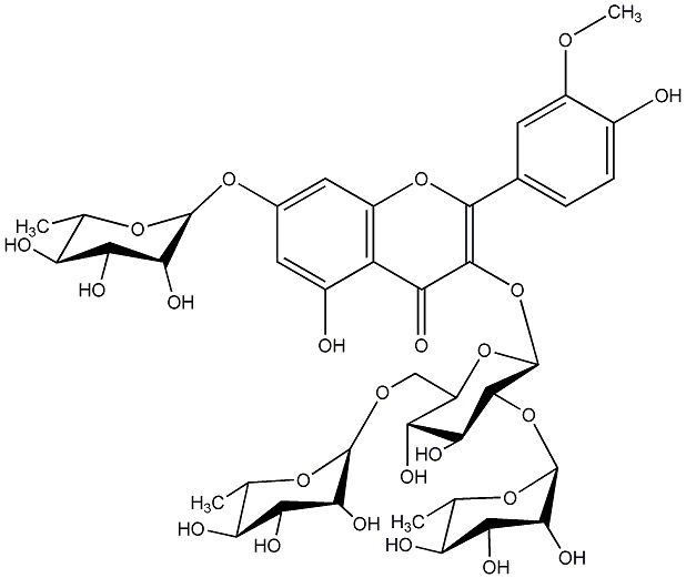 Isorhamnetin 3-(2G-rhamnosylrutinoside)-7-rhamnoside Quercetin 3'-methyl ether 3-(2G-rhamnosylrutinoside)-7-rhamnoside 3-[(O-6-Deoxy-alpha-L-mannopyranosyl-(1->2)-O-[6-deoxy-alpha-L-mannopyranosyl-(1->6)]-beta-D-glucopyranosyl)oxy]-7-[(6-deoxy-alpha-L-mannopyranosyl)oxy]-5-hydroxy-2-(4-hydroxy-3-methoxyphenyl)-4H-1-benzopyran-4-one |