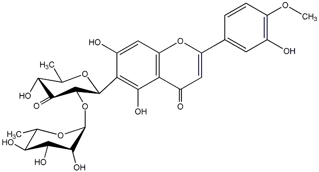 InChI=1S/C28H30O14/c1-9-21(33)24(36)27(42-28-25(37)23(35)20(32)10(2)40-28)26(39-9)19-14(31)8-17-18(22(19)34)13(30)7-16(41-17)11-4-5-15(38-3)12(29)6-11/h4-10,20-21,23,25-29,31-35,37H,1-3H3/t9-,10-,20-,21-,23+,25-,26-,27+,28-/m0/s1 |