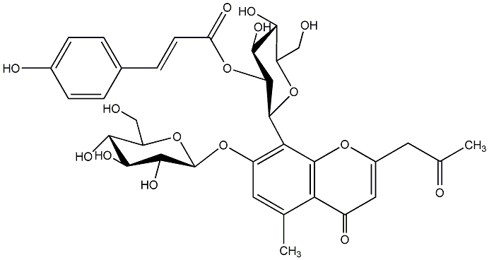 InChI=1S/C34H38O16/c1-14-9-20(48-34-30(45)28(43)26(41)22(13-36)49-34)25(31-24(14)19(39)11-18(46-31)10-15(2)37)32-33(29(44)27(42)21(12-35)47-32)50-23(40)8-5-16-3-6-17(38)7-4-16/h3-9,11,21-22,26-30,32-36,38,41-45H,10,12-13H2,1-2H3/b8-5+/t21-,22-,26-,27-,28-,29-,30+,32-,33+,34+/m0/s1 |