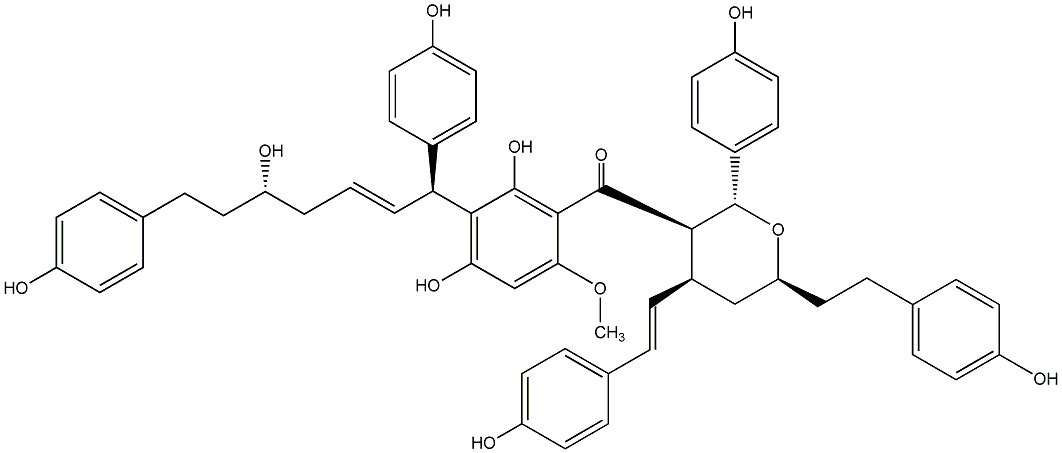 InChI=1S/C54H54O11/c1-64-48-32-47(61)50(46(36-15-26-43(59)27-16-36)4-2-3-39(55)19-6-34-9-22-41(57)23-10-34)53(63)51(48)52(62)49-38(14-5-33-7-20-40(56)21-8-33)31-45(30-13-35-11-24-42(58)25-12-35)65-54(49)37-17-28-44(60)29-18-37/h2,4-5,7-12,14-18,20-29,32,38-39,45-46,49,54-61,63H,3,6,13,19,30-31H2,1H3/b4-2+,14-5+/t38-,39-,45+,46+,49-,54-/m1/s1 |