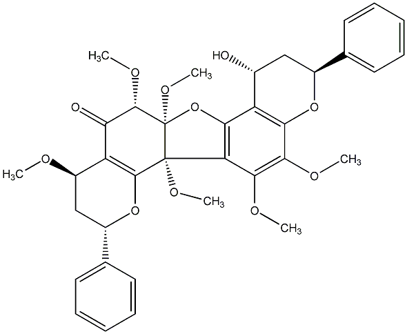 InChI=1S/C36H38O11/c1-39-24-18-23(20-15-11-8-12-16-20)46-33-26(24)28(38)34(42-4)36(44-6)35(33,43-5)27-29(47-36)25-21(37)17-22(19-13-9-7-10-14-19)45-30(25)32(41-3)31(27)40-2/h7-16,21-24,34,37H,17-18H2,1-6H3/t21-,22+,23+,24-,34-,35+,36+/m0/s1 |