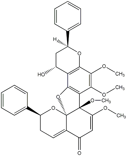 InChI=1S/C34H32O9/c1-37-26-18-22(35)21-15-16-24(19-11-7-5-8-12-19)42-34(21)33(26,40-4)28-29(43-34)27-23(36)17-25(20-13-9-6-10-14-20)41-30(27)32(39-3)31(28)38-2/h5-15,18,23-25,36H,16-17H2,1-4H3/t23-,24+,25+,33-,34+/m1/s1 |
