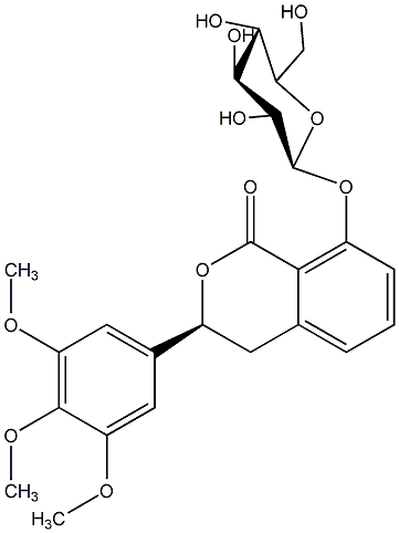 InChI=1S/C24H28O11/c1-30-15-8-12(9-16(31-2)22(15)32-3)14-7-11-5-4-6-13(18(11)23(29)33-14)34-24-21(28)20(27)19(26)17(10-25)35-24/h4-6,8-9,14,17,19-21,24-28H,7,10H2,1-3H3/t14-,17-,19-,20+,21-,24-/m1/s1 |
