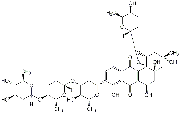 InChI=1S/C43H58O18/c1-17-23(44)8-10-31(56-17)61-43-29(47)15-41(5,53)16-42(43,54)14-25(46)34-35(43)39(51)22-7-6-21(38(50)33(22)40(34)52)27-13-28(37(49)20(4)55-27)60-30-11-9-26(18(2)57-30)59-32-12-24(45)36(48)19(3)58-32/h6-7,17-20,23-28,30-32,36-37,44-46,48-50,53-54H,8-16H2,1-5H3/t17-,18+,19-,20-,23+,24+,25+,26+,27?,28-,30-,31?,32+,36-,37+,41?,42?,43?/m0/s1 |