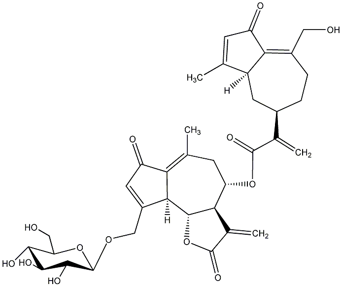 InChI=1S/C36H42O13/c1-14-7-22(39)28-19(11-37)6-5-18(9-21(14)28)16(3)34(44)47-24-8-15(2)26-23(40)10-20(29(26)33-27(24)17(4)35(45)49-33)13-46-36-32(43)31(42)30(41)25(12-38)48-36/h7,10,18,21,24-25,27,29-33,36-38,41-43H,3-6,8-9,11-13H2,1-2H3/t18-,21+,24+,25+,27-,29+,30-,31+,32+,33-,36-/m1/s1 |