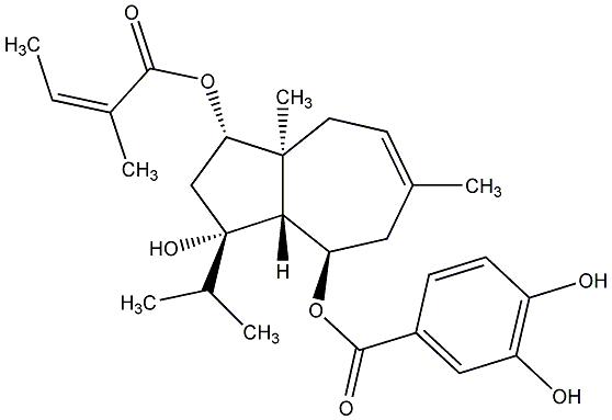 C/C=C(/C)C(=O)O[C@H]1C[C@](O)(C(C)C)[C@H]2[C@H](OC(=O)c3ccc(O)c(O)c3)CC(C)=CC[C@]12C |