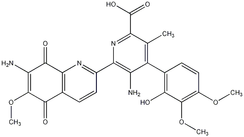 InChI=1S/C25H22N4O8/c1-9-14(10-6-8-13(35-2)23(36-3)20(10)30)15(26)19(29-17(9)25(33)34)12-7-5-11-18(28-12)22(32)16(27)24(37-4)21(11)31/h5-8,30H,26-27H2,1-4H3,(H,33,34) |