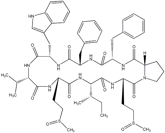 InChI=1S/C55H73N9O10S2/c1-7-34(4)47-54(71)58-41(25-28-76(6)74)55(72)64-26-16-23-45(64)52(69)61-43(30-36-19-12-9-13-20-36)50(67)59-42(29-35-17-10-8-11-18-35)49(66)60-44(31-37-32-56-39-22-15-14-21-38(37)39)51(68)62-46(33(2)3)53(70)57-40(48(65)63-47)24-27-75(5)73/h8-15,17-22,32-34,40-47,56H,7,16,23-31H2,1-6H3,(H,57,70)(H,58,71)(H,59,67)(H,60,66)(H,61,69)(H,62,68)(H,63,65)/t34-,40-,41-,42-,43-,44-,45-,46-,47-,75-,76+/m0/s1 |