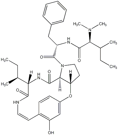 InChI=1S/C36H49N5O6/c1-7-22(3)30-33(43)37-18-16-25-14-15-26(21-28(25)42)47-29-17-19-41(32(29)35(45)39-30)36(46)27(20-24-12-10-9-11-13-24)38-34(44)31(40(5)6)23(4)8-2/h9-16,18,21-23,27,29-32,42H,7-8,17,19-20H2,1-6H3,(H,37,43)(H,38,44)(H,39,45)/b18-16-/t22-,23-,27-,29-,30-,31-,32-/m0/s1 |