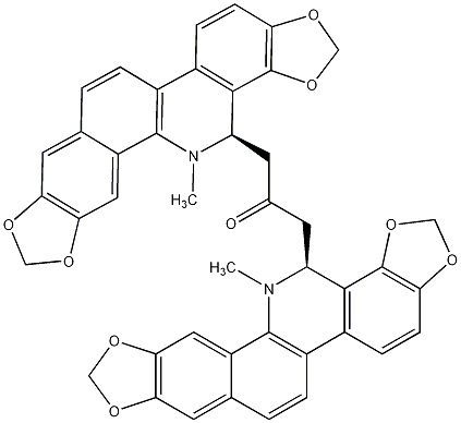 InChI=1S/C43H32N2O9/c1-44-30(38-24(7-9-32-42(38)53-19-47-32)26-5-3-21-11-34-36(51-17-49-34)15-28(21)40(26)44)13-23(46)14-31-39-25(8-10-33-43(39)54-20-48-33)27-6-4-22-12-35-37(52-18-50-35)16-29(22)41(27)45(31)2/h3-12,15-16,30-31H,13-14,17-20H2,1-2H3/t30-,31+ |