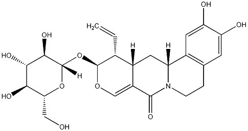 InChI=1S/C24H29NO10/c1-2-11-13-6-15-12-7-17(28)16(27)5-10(12)3-4-25(15)22(32)14(13)9-33-23(11)35-24-21(31)20(30)19(29)18(8-26)34-24/h2,5,7,9,11,13,15,18-21,23-24,26-31H,1,3-4,6,8H2/t11-,13-,15+,18+,19-,20-,21+,23-,24-/m0/s1 |