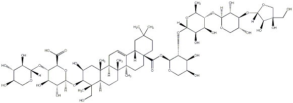 InChI=1S/C62H98O31/c1-24-41(87-50-40(76)42(30(68)20-83-50)88-54-46(77)62(81,22-64)23-85-54)35(71)38(74)51(86-24)90-44-34(70)29(67)19-84-53(44)93-55(80)61-14-12-56(2,3)16-26(61)25-8-9-32-57(4)17-27(65)47(58(5,21-63)31(57)10-11-60(32,7)59(25,6)13-15-61)92-52-39(75)36(72)43(45(91-52)48(78)79)89-49-37(73)33(69)28(66)18-82-49/h8,24,26-47,49-54,63-77,81H,9-23H2,1-7H3,(H,78,79)/t24-,26-,27-,28+,29+,30+,31+,32+,33-,34-,35+,36-,37+,38+,39+,40+,41-,42-,43-,44+,45-,46-,47-,49-,50-,51-,52-,53-,54-,57+,58-,59+,60+,61-,62+/m0/s1 |