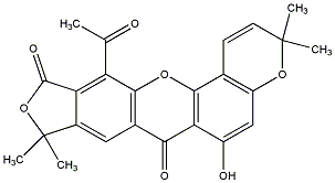 InChI=1S/C24H20O7/c1-10(25)16-17-13(24(4,5)31-22(17)28)8-12-19(27)18-14(26)9-15-11(20(18)29-21(12)16)6-7-23(2,3)30-15/h6-9,26H,1-5H3 |