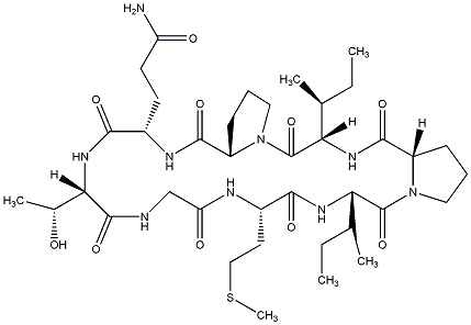InChI=1S/C38H63N9O10S/c1-7-20(3)29-37(56)47-17-10-12-26(47)35(54)44-30(21(4)8-2)38(57)46-16-9-11-25(46)34(53)42-23(13-14-27(39)49)32(51)45-31(22(5)48)36(55)40-19-28(50)41-24(15-18-58-6)33(52)43-29/h20-26,29-31,48H,7-19H2,1-6H3,(H2,39,49)(H,40,55)(H,41,50)(H,42,53)(H,43,52)(H,44,54)(H,45,51)/t20-,21-,22+,23-,24-,25-,26-,29-,30-,31-/m0/s1 |
