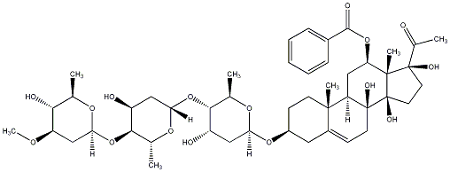 InChI=1S/C47H68O16/c1-24-39(51)33(56-7)22-38(57-24)63-41-26(3)59-37(21-32(41)50)62-40-25(2)58-36(20-31(40)49)60-30-14-15-43(5)29(19-30)13-16-46(54)34(43)23-35(61-42(52)28-11-9-8-10-12-28)44(6)45(53,27(4)48)17-18-47(44,46)55/h8-13,24-26,30-41,49-51,53-55H,14-23H2,1-7H3/t24-,25-,26-,30+,31+,32+,33-,34-,35-,36+,37+,38+,39-,40-,41-,43+,44-,45-,46+,47-/m1/s1 |