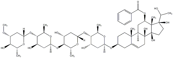 InChI=1S/C53H80O19/c1-26-44(58)37(63-8)24-43(64-26)72-47-29(4)67-42(23-36(47)57)71-46-28(3)66-41(22-35(46)56)70-45-27(2)65-40(21-34(45)55)68-33-15-16-49(6)32(20-33)14-17-52(61)38(49)25-39(69-48(59)31-12-10-9-11-13-31)50(7)51(60,30(5)54)18-19-53(50,52)62/h9-14,26-30,33-47,54-58,60-62H,15-25H2,1-8H3/t26-,27-,28-,29-,30-,33+,34+,35-,36-,37-,38-,39-,40+,41+,42+,43+,44-,45-,46-,47-,49+,50-,51-,52+,53-/m1/s1 |