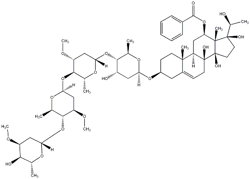 InChI=1S/C55H84O19/c1-28-46(58)37(63-8)24-43(66-28)73-48-31(4)69-45(26-39(48)65-10)74-49-30(3)68-44(25-38(49)64-9)72-47-29(2)67-42(23-36(47)57)70-35-17-18-51(6)34(22-35)16-19-54(61)40(51)27-41(71-50(59)33-14-12-11-13-15-33)52(7)53(60,32(5)56)20-21-55(52,54)62/h11-16,28-32,35-49,56-58,60-62H,17-27H2,1-10H3/t28-,29-,30-,31-,32+,35+,36+,37+,38-,39-,40-,41-,42+,43+,44+,45+,46-,47-,48-,49-,51+,52-,53-,54+,55-/m1/s1 |
