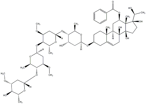 InChI=1S/C55H84O19/c1-28-46(58)37(63-8)24-43(66-28)73-48-31(4)69-45(26-39(48)65-10)74-49-30(3)68-44(25-38(49)64-9)72-47-29(2)67-42(23-36(47)57)70-35-17-18-51(6)34(22-35)16-19-54(61)40(51)27-41(71-50(59)33-14-12-11-13-15-33)52(7)53(60,32(5)56)20-21-55(52,54)62/h11-16,28-32,35-49,56-58,60-62H,17-27H2,1-10H3/t28-,29-,30-,31-,32+,35+,36+,37-,38+,39-,40-,41-,42+,43+,44+,45+,46-,47-,48-,49-,51+,52-,53-,54+,55-/m1/s1 |