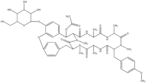 COc1ccc(CC2C(=O)NC(C)C(=O)N(C)C3Cc4ccc(cc4)Oc4cc(ccc4OC4OC(CO)C(O)C(O)C4O)C(OC(C)=O)C(C(=O)NC(C)C(=O)NC(C)C(=O)N2C)N(C)C3=O)cc1 |