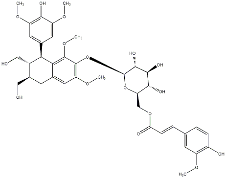 COc1cc(/C=C/C(=O)OC[C@H]2O[C@@H](Oc3c(OC)cc4c(c3OC)[C@H](c3cc(OC)c(O)c(OC)c3)[C@@H](CO)[C@H](CO)C4)[C@H](O)[C@@H](O)[C@@H]2O)ccc1O |