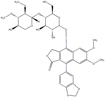 InChI=1S/C34H38O16/c1-40-20-8-15-16(9-21(20)41-2)28(17-11-44-32(39)25(17)24(15)14-5-6-19-22(7-14)47-13-46-19)49-33-27(38)26(37)30(23(10-35)48-33)50-34-31(43-4)29(42-3)18(36)12-45-34/h5-9,18,23,26-27,29-31,33-38H,10-13H2,1-4H3/t18-,23-,26-,27-,29+,30-,31-,33+,34+/m1/s1 |