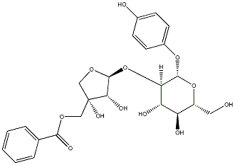 InChI=1S/C24H28O12/c25-10-16-17(27)18(28)19(22(35-16)34-15-8-6-14(26)7-9-15)36-23-20(29)24(31,12-33-23)11-32-21(30)13-4-2-1-3-5-13/h1-9,16-20,22-23,25-29,31H,10-12H2/t16-,17+,18+,19-,20+,22-,23+,24-/m1/s1 |