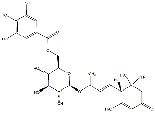 InChI=1S/C26H34O12/c1-12-7-15(27)10-25(3,4)26(12,35)6-5-13(2)37-24-22(33)21(32)20(31)18(38-24)11-36-23(34)14-8-16(28)19(30)17(29)9-14/h5-9,13,18,20-22,24,28-33,35H,10-11H2,1-4H3/b6-5+/t13-,18-,20-,21+,22-,24-,26-/m1/s1 |