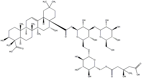 InChI=1S/C54H84O25/c1-48(2)14-15-54(24(16-48)23-8-9-28-50(4)12-11-30(56)53(7,46(69)70)29(50)10-13-51(28,5)52(23,6)17-31(54)57)47(71)79-45-41(68)42(78-44-40(67)37(64)34(61)25(20-55)75-44)36(63)27(77-45)22-74-43-39(66)38(65)35(62)26(76-43)21-73-33(60)19-49(3,72)18-32(58)59/h8,24-31,34-45,55-57,61-68,72H,9-22H2,1-7H3,(H,58,59)(H,69,70)/t24-,25+,26+,27+,28+,29+,30-,31+,34+,35+,36+,37-,38-,39+,40+,41+,42-,43+,44+,45-,49+,50+,51+,52+,53-,54+/m0/s1 |