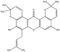 InChI=1S/C28H28O6/c1-14(2)7-8-17-22(30)26-16(10-12-28(5,6)34-26)20-23(31)21-19(32-24(17)20)13-18(29)15-9-11-27(3,4)33-25(15)21/h7,9-13,29-30H,8H2,1-6H3 |