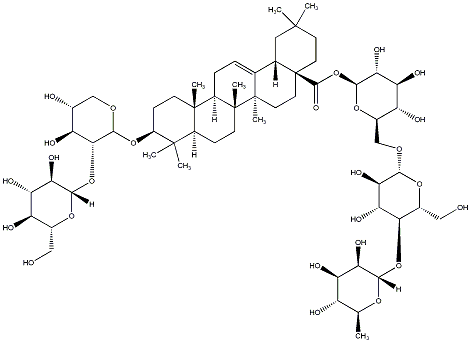 InChI=1S/C59H96O26/c1-24-34(63)38(67)42(71)49(78-24)83-46-29(21-61)80-48(45(74)41(46)70)77-23-30-37(66)40(69)44(73)51(81-30)85-53(75)59-17-15-54(2,3)19-26(59)25-9-10-32-56(6)13-12-33(55(4,5)31(56)11-14-58(32,8)57(25,7)16-18-59)82-52-47(35(64)27(62)22-76-52)84-50-43(72)39(68)36(65)28(20-60)79-50/h9,24,26-52,60-74H,10-23H2,1-8H3/t24-,26-,27+,28+,29+,30+,31-,32+,33-,34-,35+,36+,37+,38+,39-,40-,41+,42+,43+,44+,45+,46+,47+,48+,49-,50-,51-,52-,56-,57+,58+,59-/m0/s1 |