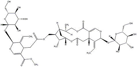 InChI=1S/C43H60O22/c1-6-19-22(25(38(54)56-5)15-59-40(19)64-42-36(52)34(50)32(48)28(11-44)62-42)9-30(46)57-14-24-18(4)27-8-21(24)17(3)13-58-39(55)26-16-60-41(20(7-2)23(26)10-31(47)61-27)65-43-37(53)35(51)33(49)29(12-45)63-43/h6-7,15-18,21-24,27-29,32-37,40-45,48-53H,8-14H2,1-5H3/b19-6+,20-7+/t17-,18+,21+,22-,23-,24-,27-,28+,29+,32+,33+,34-,35-,36+,37+,40-,41-,42-,43-/m0/s1 |
