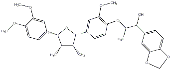 InChI=1S/C31H36O8/c1-17-18(2)31(39-30(17)21-8-10-23(33-4)26(14-21)34-5)22-9-12-25(27(15-22)35-6)38-19(3)29(32)20-7-11-24-28(13-20)37-16-36-24/h7-15,17-19,29-32H,16H2,1-6H3/t17-,18-,19+,29+,30+,31+/m0/s1 |