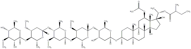 InChI=1S/C62H104O23/c1-16-29(2)57(67)79-35(8)61(68)21-22-62(69)39-18-17-37-23-38(19-20-59(37,10)40(39)24-45(60(61,62)11)80-36(9)63)81-46-25-41(64)52(31(4)74-46)82-47-26-42(70-12)53(32(5)75-47)83-48-27-43(71-13)54(33(6)76-48)84-49-28-44(72-14)55(34(7)77-49)85-58-51(66)56(73-15)50(65)30(3)78-58/h29-35,37-56,58,64-66,68-69H,16-28H2,1-15H3/t29-,30+,31+,32+,33+,34+,35-,37-,38-,39+,40-,41-,42-,43+,44+,45+,46+,47-,48-,49-,50+,51+,52+,53+,54+,55+,56-,58-,59-,60+,61+,62-/m0/s1 |