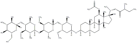 InChI=1S/C55H92O22/c1-13-25(2)49(62)71-29(6)54(63)18-19-55(64)33-15-14-31-20-32(16-17-52(31,8)34(33)21-38(53(54,55)9)72-30(7)57)73-39-22-35(65-10)45(26(3)68-39)75-40-23-36(66-11)46(27(4)69-40)76-51-44(61)48(67-12)47(28(5)70-51)77-50-43(60)42(59)41(58)37(24-56)74-50/h25-29,31-48,50-51,56,58-61,63-64H,13-24H2,1-12H3/t25-,26-,27-,28-,29+,31+,32+,33-,34+,35+,36+,37-,38-,39-,40+,41-,42+,43-,44-,45-,46-,47-,48-,50+,51+,52+,53-,54-,55+/m1/s1 |