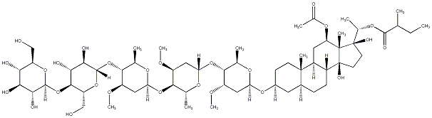 InChI=1S/C61H102O26/c1-13-27(2)55(70)79-31(6)60(71)18-19-61(72)35-15-14-33-20-34(16-17-58(33,8)36(35)21-42(59(60,61)9)80-32(7)64)81-43-22-37(73-10)51(28(3)76-43)84-44-23-38(74-11)52(29(4)77-44)85-45-24-39(75-12)53(30(5)78-45)86-57-50(69)48(67)54(41(26-63)83-57)87-56-49(68)47(66)46(65)40(25-62)82-56/h27-31,33-54,56-57,62-63,65-69,71-72H,13-26H2,1-12H3/t27-,28-,29-,30-,31+,33+,34+,35-,36+,37+,38+,39-,40-,41-,42-,43-,44+,45+,46-,47+,48-,49-,50-,51-,52-,53-,54-,56+,57+,58+,59-,60-,61+/m1/s1 |