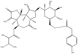 InChI=1S/C34H42O13/c1-14(2)27(37)33(42)44-22-10-15(3)20-12-21(16(4)25(20)31-26(22)17(5)32(41)47-31)45-34-30(40)29(39)28(38)23(46-34)13-43-24(36)11-18-6-8-19(35)9-7-18/h6-9,14,20-23,25-31,34-35,37-40H,3-5,10-13H2,1-2H3/t20-,21-,22+,23+,25-,26+,27-,28+,29-,30+,31+,34+/m0/s1 |