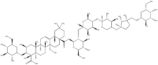InChI=1S/C64H102O34/c1-24-46(95-50-42(78)37(73)31(20-87-50)94-55-48(82)64(86,23-89-55)22-88-51-43(79)38(74)34(70)28(17-65)91-51)41(77)45(81)52(90-24)96-47-40(76)36(72)30(19-67)93-54(47)98-57(85)62-12-11-58(2,3)15-26(62)25-7-8-32-59(4)16-27(69)49(97-53-44(80)39(75)35(71)29(18-66)92-53)61(6,56(83)84)33(59)9-10-60(32,5)63(25,21-68)14-13-62/h7,24,26-55,65-82,86H,8-23H2,1-6H3,(H,83,84)/t24-,26-,27-,28+,29+,30+,31-,32+,33+,34-,35+,36+,37-,38-,39-,40-,41-,42+,43+,44+,45+,46-,47+,48-,49-,50-,51+,52-,53+,54-,55-,59+,60+,61-,62-,63-,64+/m0/s1 |